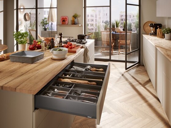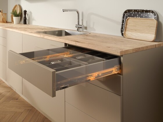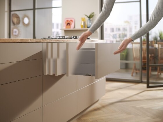Cabinets always close softly and effortlessly thanks to integrated soft-close BLUMOTION. For handleless fronts, simply combine MERIVOBOX with the SERVO-DRIVE electrical motion support system or the TIP-ON mechanical opening support system. Thanks to the identical drilling positions, your manufacturing processes are always the same. Motion technologies can even be easily retrofitted later.