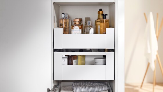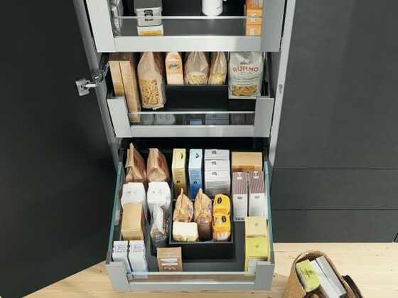 SPACE TOWER is Blum's idea for a pantry cabinet. It offers ample storage space, has individual inner drawers that can be tailored to your needs and provides easy access to storage items from all sides. It's the convenient and ergonomic way to store goods.