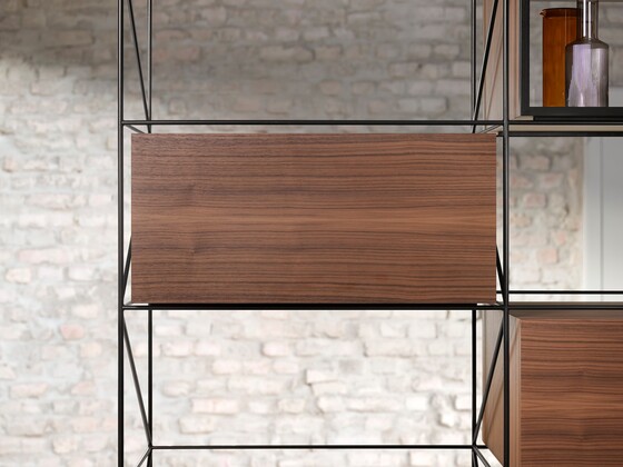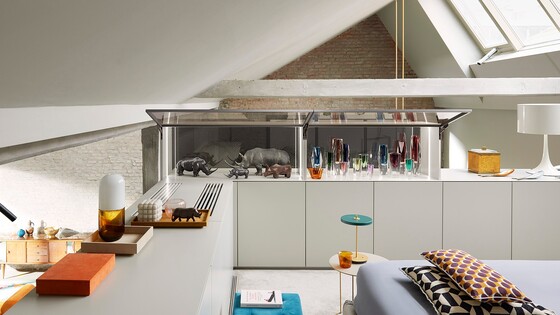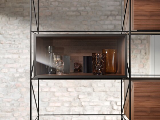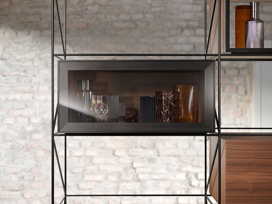 The integrated lift system remains invisible when closed – even with glass fronts. When open, the visible parts of AVENTOS HKi are in an elegant onyx black.