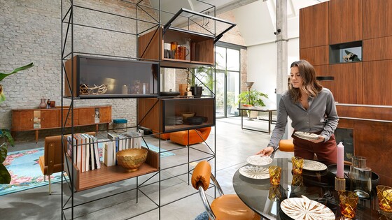 The technology of the integrated lift system is concealed in the side panel, yet still gives total control: lift mechanism adjustment from the front, integrated opening angle restriction and variable stop. This enables full freedom of movement and easy access to storage items.