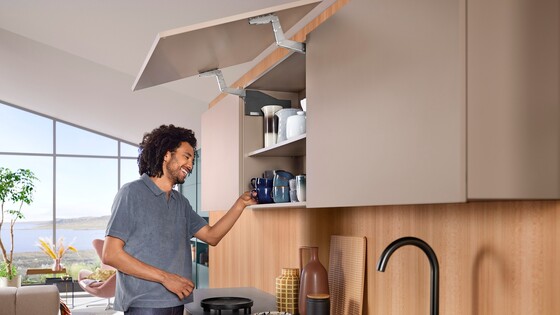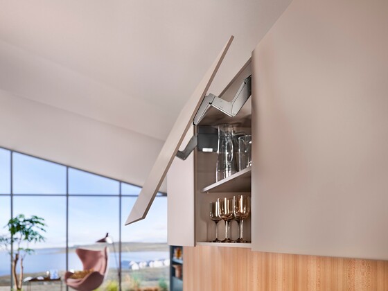 The AVENTOS HS top lift system exudes a sense of weightlessness as large one-part doors can be opened with the utmost ease. The door swings up and over the cabinet, giving you easy access to storage items. A compelling feature that gives your cabinet design more scope – like integrating cornices or crown moldings.