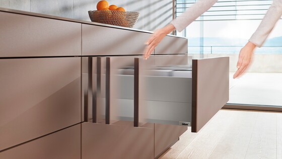 To incorporate handleless fronts in cabinets, simply combine MERIVOBOX with the TIP-ON BLUMOTION mechanical opening support system. This combination is possible thanks to the fully redesigned, innovative L-shaped cabinet profile of MERIVOBOX. Different TIP-ON BLUMOTION units are available to suit different nominal lengths and weight ranges. All other components are universal.